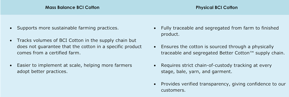 In 2025, we took the next step in our sustainability journey by committing to Physical BCI Cotton, becoming certified against the Better Cotton™ Chain of Custody Standard, enabling us to purchase and sell Physical Better Cotton™.